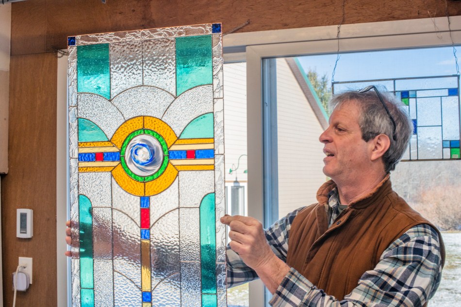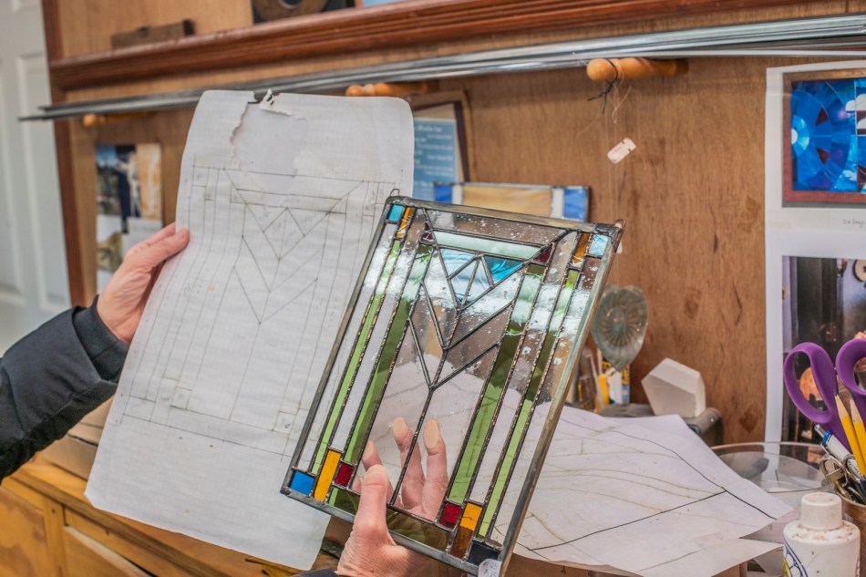Dan returns and stands up the window he was working on. He explains how daylight coming in, artificial light indoors at night, and even moonlight create different effects. He talks about iridized glass, which appears clear but reflects dynamic color when different light hits it at different angles. “We talk to customers about southern exposure, northern exposure,” he says. “It’s a changing work of art.”