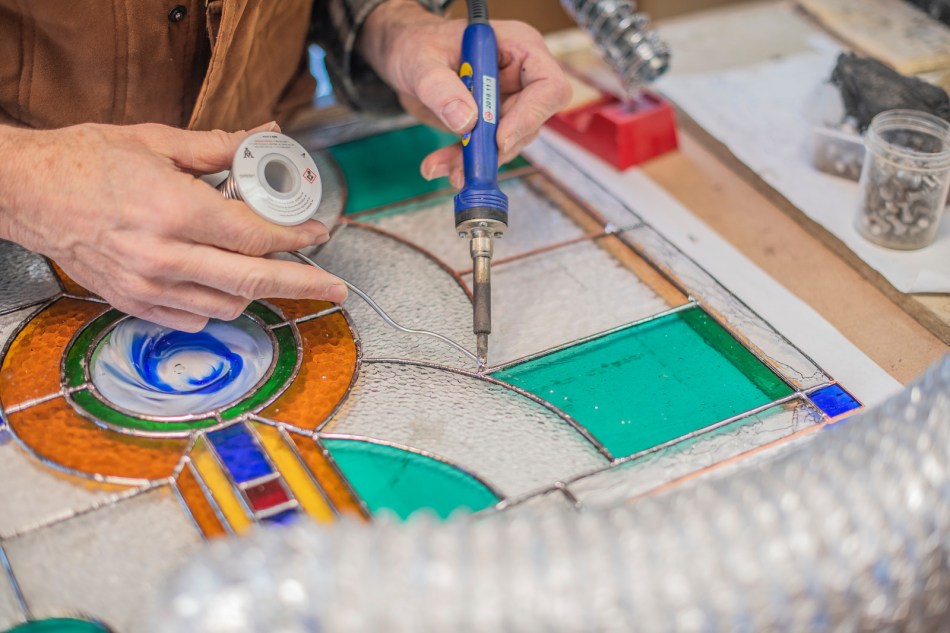 Jill moves around the edges of the room as Dan is leaned over a table at the center, soldering the seams of a tall stained-glass window. “This is a custom piece,” she says. Keeping my hands clear of Dan’s path and the trails of hot, liquid metal, I run my fingers along the textured glass panels. The colors and patterns are arranged to highlight a rondel that the client found and wanted featured, but she needed two windows so Dan made her a second rondel to match. Jill, however, does the design work.