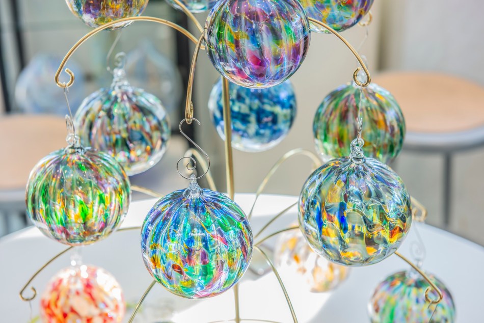 A stroll through the studio shop validates this. The work is breathtaking. Colors sliding through smooth glass look like melting kaleidoscopes paused and held captive. Dan’s work with murrine offers dramatic effects in a variety of pieces from the simple to the stunning. Equally as beautiful, his partner’s collection includes gaze-worthy art for the shelf or everyday use. Worked through the space, Jill’s designs filter the light and catch the eye. Ornaments, suncatchers, figurines, decorative pieces, beverage glasses, and more, all in exquisite color, present visitors with a selection guaranteed to captivate.