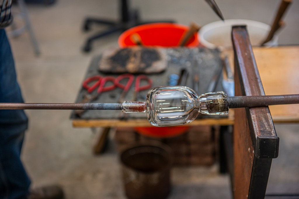 “You can’t believe how much heat is coming out, but you get used to it,” Dan adds. He moves around the space blowing and rolling and shaping the glowing glass bubble at the end of a long rod and recalls how his instructors would make them stand near the furnaces just to get acclimated.