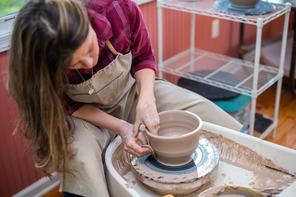 With no pressure to put her career in the kiln, she is truly living in the muddy moment. Her hands gliding up and down a shapeless mass of spinning, wet clay, Melissa brings form, and sometimes function, to that which you and I would shake from our boots on a rainy day. For her, this creative process is a zone, an almost meditative state. “Working on the wheel,” she says, “definitely forces you to really focus on this. You really can’t be worrying about other things or focused on your next to-do list. This really forces you to let that all go.”