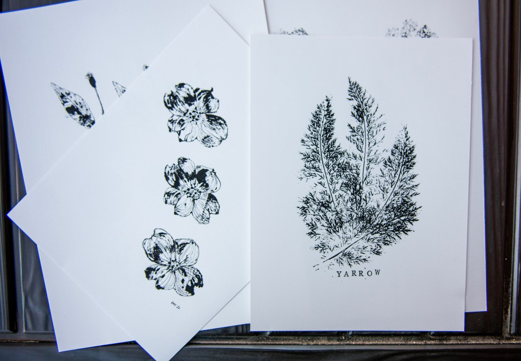 “I wanted to make her something really cool. She loves dogwoods, and I thought, ‘I wonder what it would look like if I just dipped it in ink.’” Robin deemed the result worth practicing and wound up creating the process for her prints with some experimentation and honing.