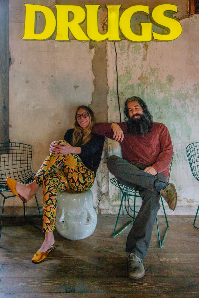 Owners Fiona and Steven Trachtenberg sit in front of the most Instagrammed spot at Dharma Bums. ”People love it,” Steven chuckles. Photo by Kristina Gibb Photography.